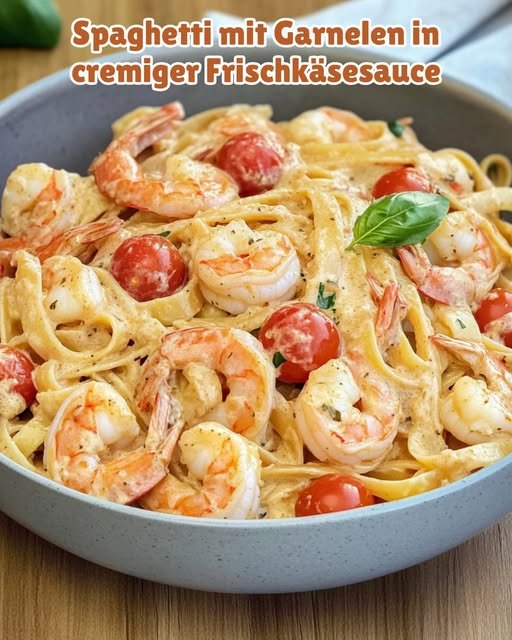 Garnelen Spaghetti in leckere Knoblauch Frischkäsesauce 200 g Spaghetti 300 g Garnelen, ohne Schale, roh 400 ml Sahne…